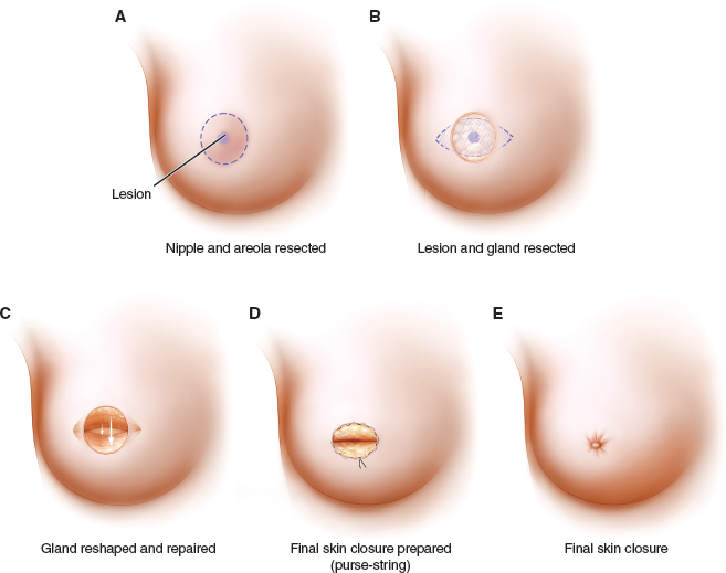 Periareolar 5 incisions provide good results if the tumor is located close to the areola; otherwise extended skin undermining can leave disfiguring skin retractions. Subareolar tumors can be performed by periareolar excision of the NAC and tumor, with purse-string closure and glandular plication (A through E). When the tumor is located in the upper outer quadrant, a radial scar allows good exposure of the tumor site, but it is recommended that the scar be lowered to avoid crossing the décolleté line. If the scar must extend toward the axilla for lymph node dissection, using a broken line is suggested to decrease scar contraction and skin retraction.