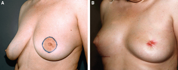 This patient had a central tumor (A). She is shown after a central quadrantectomy with a glandular defect, skin undermining, gland closure, and purse-string skin closure (B).