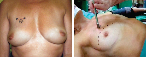 The midline should be marked between the breasts and inframammary folds. These markings are used to assess symmetry after the operation. The planned skin incisions are drawn in permanent marker with the patient still standing. There is general agreement among breast surgeons that radial incisions are performed in the lower middle part of the breast and circumareolar incisions in the upper middle part.