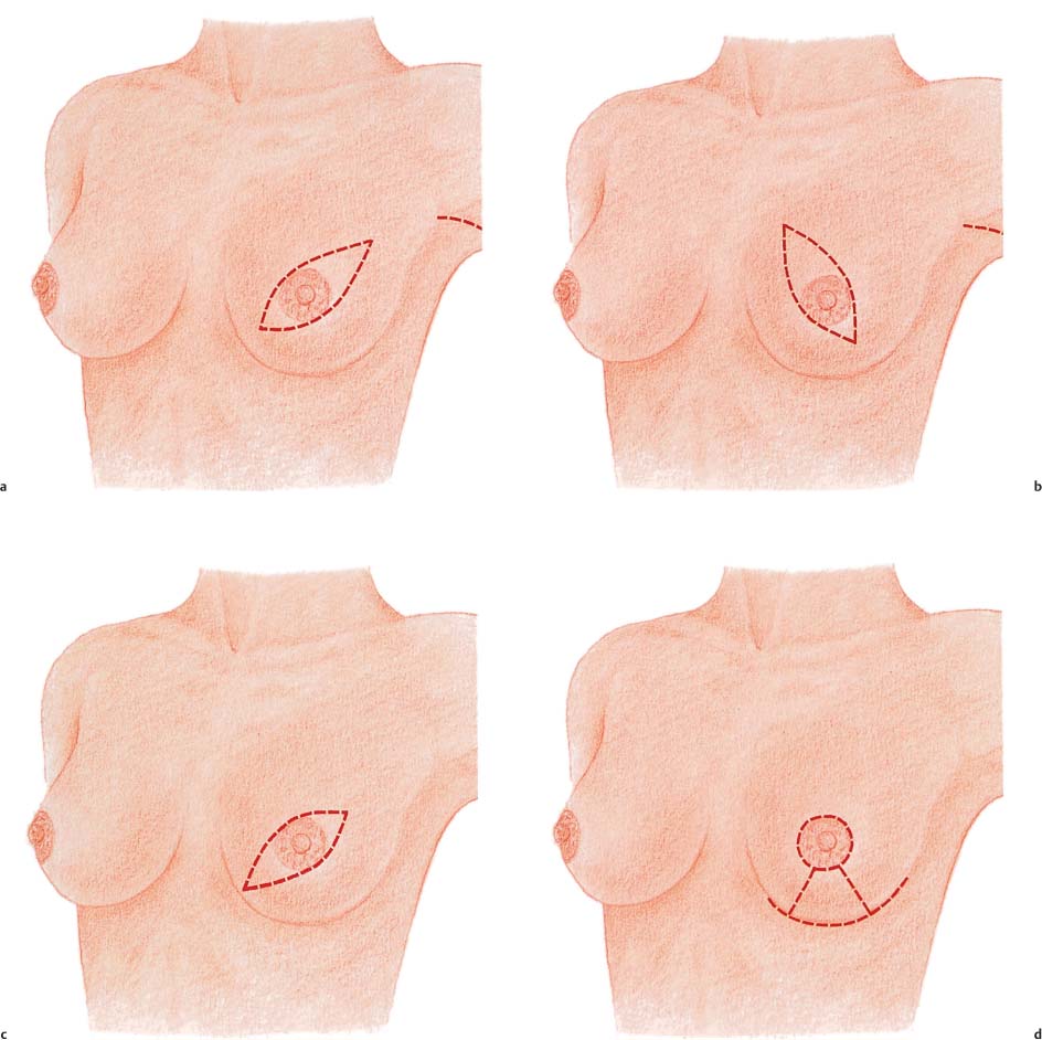 The preferred incision is transverse or oblique, and extends from superolateral to inferomedial. Resection of tumors high in the superomedial quadrant is challenging, in that the scar may extend into the cleavage area. Ultimately, the primary concern is local tumor control.