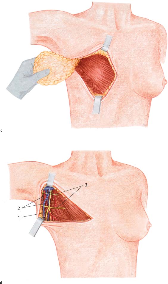 In modified radical mastectomy, classic axillary dissection is performed en bloc. Dissection is carried from the peripheral projections of the breast tissue over the lateral border of the pectoralis directly into the axillary adipose tissue. Further exposure is carried out as described in the section on axillary dissection in Chapter 10 (p. 227).