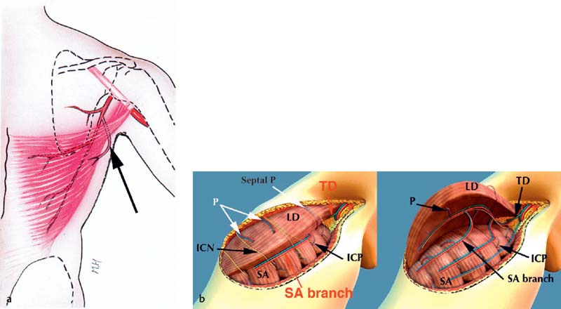 The major vascular axis supplying the TDAP flap is the same that supplies the LD muscle, namely the thoracodorsal (TD) vessels; the medial and inferior portions of the muscle get its vascular supply from intercostal and paraspinal perforators. After originating from the subscapular vessels, the TD vessels course toward the LD muscle. On reaching the deep surface of the muscle, the TD vessels most commonly divide into two primary muscular branches: the transverse branch and the lateral or vertical branch ( Fig. 9.1a ). These branches usually diverge at near 45-degree angles to one another. Both travel from the deep surface of the muscle to become intramuscular. The lateral branch courses vertically and at 2 to 3 cm inside the lateral border of the LD. The TD vessel supplies the muscle by its course in the muscle (parallel to its fibers), and supplies the overlying skin by perforators coursing from the TD vessels perpendicularly to the skin surface ( Fig. 9.1b ). The first perforator is located 6 to 8 cm below the posterior axillary fold and may either be a branch of the distal main TD or arise from its lateral branch. Subsequent perforators, up to a total of three, arise at 1.5- to 4-cm intervals inferiorly off the lateral branch. The first and second perforators are found in most people.18 Each perforator displays a 3- to 5-cm oblique course through the substance of the muscle, giving off numerous muscular branches before penetrating through the dorsal thoracic fascia to supply the overlying skin and subcutaneous fat layers. Each perforating artery is 0.3 to 0.6 mm in diameter and accompanied by two venae comitantes. Heitmann et al19 described two rows of perforators arising from the main pedicle at the lateral border of the LD muscle. The lateral row does not pierce the muscle and provides for the direct TDAP perforators ( Fig. 9.1 ). The medial row of perforators courses through the muscle (perforating it) before reaching the skin and subcutaneous tissues.