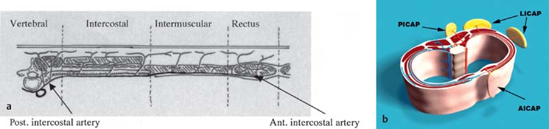 There are four segments of the intercostal vessels: vertebral, intercostal, intermuscular, and rectus ( Fig. 9.2 ). The ICAP flaps are classified as follows ( Fig. 9.2b):