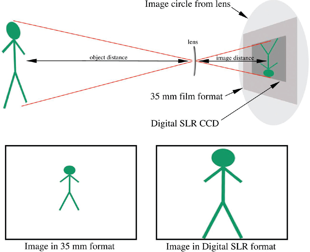 Sensors can vary widely in size, but are typically smaller than conventional 35-mm film frame. As a result, when taken in identical photographic environments, the digital image sensor only captures the central portion of an image as compared to a full 35-mm film frame, thus producing a cropped image ( Fig. 9.1 ). In effect, this mimics the properties of a lens with a longer focal length and smaller field of view. The effective lengthening of focal length is termed the focal length multiplier (FLM) and is used to correct the size of the sensor in relationship to the traditional 35-mm window. The focal length multiplier can be calculated by dividing the diagonal of a 35-mm film frame by the diagonal of the sensor. For instance, a dSLR camera with a FLM of 1.5 and a lens with a 60-mm focal length produces an image similar to a 35-mm film SLR with a focal length of 90-mm (60-mm × 1.5). 3 , 4