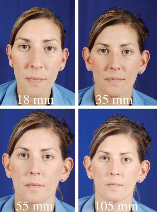 One of the many advantages of using an SLR camera is the ability to interchange lenses between camera bodies, depending on the type of photograph needed. Each lens is designed with a set focal length, which is defined as the distance in millimeters from the optical center of the lens to the focal point (which is located on either the digital image sensor or film). For the purposes of facial plastic surgery, the ideal focal length is between 90 and 105 mm. These types of lenses are known as “portrait” or “macro” lenses, and are designed for near focusing. 5 Lenses with a shorter focal length of 50 to 60 mm have a wider angle of view, and are commonly utilized in photodocumentation for aesthetic procedures outside of the face and neck. However, these lenses produce a centralbulging or “fish eye” appearance when used to photograph the face, and as such must be avoided in facial plastic surgery ( Fig. 9.2 ). 4