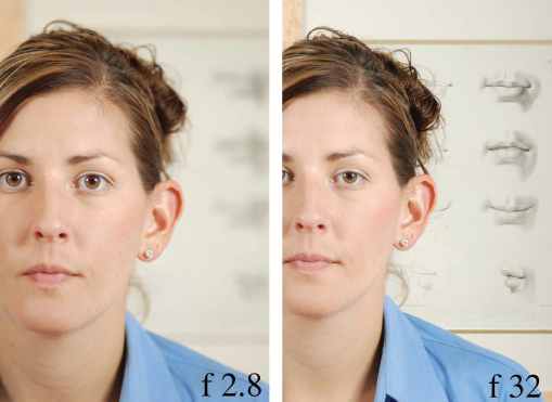 The DOF varies inversely with the focal length. Therefore, lenses with a longer focal length such as those used in portrait photography have a shallower DOF and vice versa. As previously mentioned, the ideal focal length for use in facial plastic surgery is between 90 and 105 mm, since this setting produces accurate portrait images with minimal distortion. Subsequently, the lens focal length cannot be easily utilized to adjust to the desire DOF. Similarly, the photographer-to-subject distance may also be difficult to alter, based on the space restrictions of the photographic studio being used.