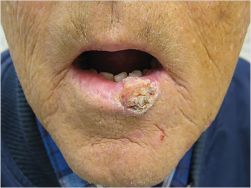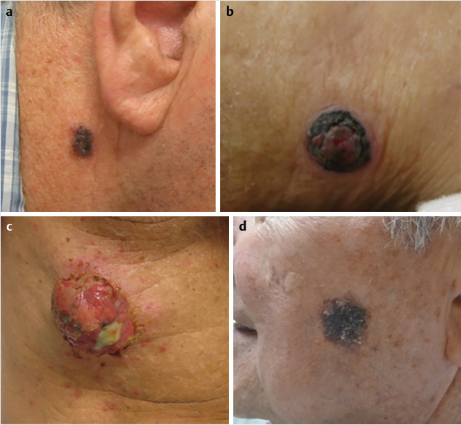 Evaluating a patient with a concerning cutaneous lesion should start with a thorough history and physical examination. History gathering should include assessment for risk factors/exposures, systemic symptoms such as weight loss and fatigue, and details of the lesion(s) (e.g., duration the lesion has been present, rate of growth, and prior treatment modalities). Particular vigilance should be used in evaluating solid-organ transplant recipients as these patients require more timely treatment. 15 Paresthesias and/or local weakness should also be assessed to rule out perineural invasion. Physical examination should include a thorough skin assessment, addressing the lesion’s size, defining characteristics, depth (superficial versus deep), and evidence of prior treatment (i.e., scarring or hypopigmentation from prior cryotherapy). Examination should also assess the local nerve function, lymph node basins, and mucosal surfaces. For melanoma detection in particular, both patients and providers are instructed to use the simple, yet effective, ABCDE tool: asymmetry, border irregularity, color variegation, diameter greater than 6 mm, and evolution of the lesion with time. 16 Other strategies include looking for the “ugly duckling” or single striking lesion unlike surrounding benign lesions and the “Little Red Riding Hood” sign (erythema/inflammation around the lesion). Dermoscopy supplements the skin examination by detecting subtle lesions and improving diagnostic accuracy. 17 Baseline photographs are also recommended to detect new or changing lesions.