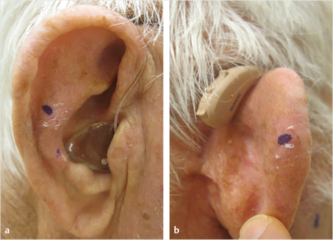 Both clinical and histologic features contribute to the subtyping of BCC. While over 26 types have been described, we will focus on the most distinctive. These can be classified into two general categories: well-circumscribed (nodular, basosquamous) and diffuse (superficial, morpheaform, infiltrative, micronodular). 6 Nodular BCC is the most common, often recognized as a pearly, flesh-colored papule with a raised border and central dell. There are often arborizing telangiectasias, which can best be appreciated on skin surface microscopy or epiluminescence microscopy (dermoscopy) and ulceration (Fig. 9‑1a). Basosquamous types have a squamous component and carry a higher risk of metastasis (unlike BCC, with a metastatic rate of <0.1%). 5 Diffuse BCC generally exhibits a more plaque-like appearance with ill-defined margins. Superficial spreading is the second most common type of BCC; however, the most common in younger patients. 1 It often has a scale or crust with an erythematous border that slowly expands, making it easily mistaken for a localized fungal infection or inflammatory reaction, such as eczema (Fig. 9‑1b). 6 Micronodular BCC is defined by finely palpable nodules with nests of malignant cells that invade the dermis, making recurrence high. Morpheaform or sclerosing type is a firm lesion that can resemble a scar. It can be challenging to treat as it often extends several millimeters radially within the dermis beyond what is visually appreciated and thus positive margins are often noted on final pathology. 5 Lastly, infiltrative BCC presents with an irregular configuration and has a very aggressive course. It should be noted that while a majority of BCC are flesh-colored, some may exhibit pigmentation.