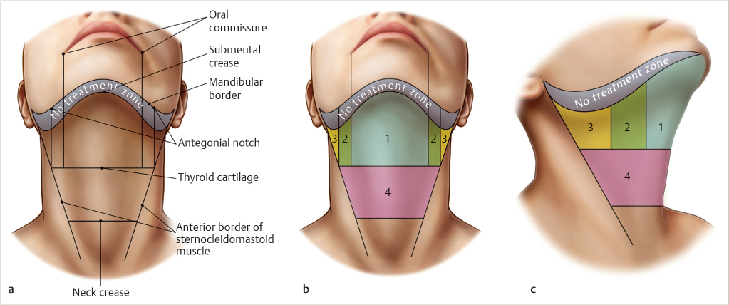 • Safe Zone 2 (Bilateral): Inferior edge of the No Treatment Zone (superior border), lateral extension of thyroid cartilage (inferior border), caudal continuation of oral commissure (medial border), and antegonial notch (lateral border) (Fig. 93.2b, c)