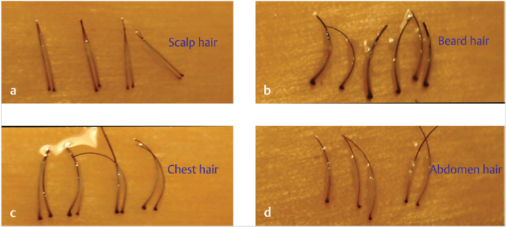 Fig. 69.1 Follicular unit grafts pictures from different parts of the body. (a) Scalp. (b) Beard. (c) Chest. (d) Abdomen.