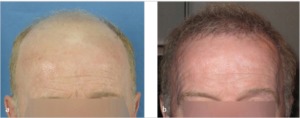 Fig. 69.3 Example scalp + body follicular unit excision (FUE). Total 1035 grafts (3,729 scalp, 2,480 beard, and the rest from the chest, abdomen, and armpit). (a) Before. (b) After.