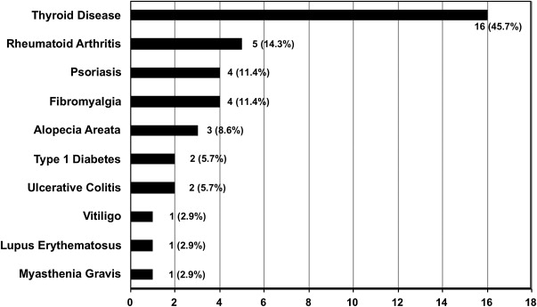 Because several comorbidities have been reported with various autoimmune diseases, it was next assessed whether other autoimmune diseases and cancers were prevalent among patients in the study population. Thirty-five of all 171 PV patients (20.5%) reported an additional autoimmune diagnosis. Nearly half (n = 16) of these were affected by autoimmune thyroid disease ( Fig. 1 ). A history of cancer was reported in 19 of the 171 PV patients (11%). Twelve of these 19 patients reported a history of skin cancer of an unspecified type. A limited number of patients listed cervical- (n = 2), prostate- (n = 2), breast- (n = 1), stomach/colon- (n = 1), or thyroid cancer (n = 1), and thymoma (n = 1). No patients reported a history of lymphoma or leukemia.