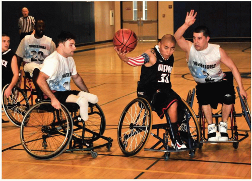 FIGURE 23-1 Retired Marine Josue Barron (#35), a member of the Naval Medical Center San Diego (NMCSD) Wolfpack wheelchair basketball team, keeps the ball away from the Fort Sam Warriors. Wolfpack is made up of 13 military and civilian members and is one of 10 teams in the West Coast Conference of the National Wheelchair Basketball Association. (Courtesy of U.S. Navy, photo by Mass Communication Specialist Seaman Pyoung K. Yi/Released.)