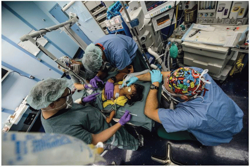 FIGURE 23-2 Service members, assigned to the hospital ship USNS Mercy (T-AH 19), perform a fractional CO2 laser procedure on a child during Pacific Partnership 2015. (Courtesy of U.S. Navy, photo by Petty Officer 2nd Class Mark El-Rayes/Released.)