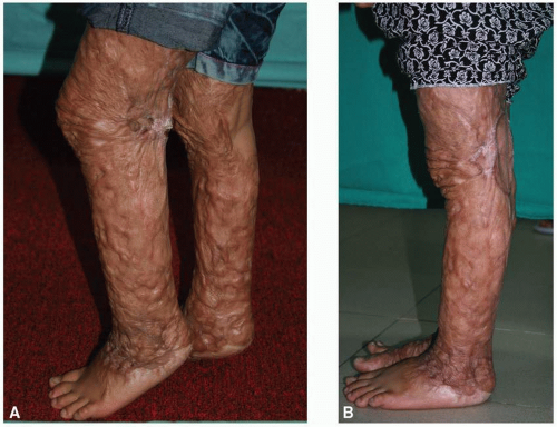 FIGURE 23-3 A: A 4-year-old girl approximately 16 months after suffering burns over approximately 60% of her total body surface area, and approximately 12 and 4 months from her first and second ablative fractional laser treatments, respectively. Although significant interval enhancements in scar pliability and range of motion were noted, a flexion contracture at the knee and loss of pliability of the tissues surrounding the ankle precluded normal ambulation. B: Approximately 10 months after contracture excision, placement of a bovine collagen and glycosaminoglycan meshed bilayer dressing (INTEGRA Meshed Bilayer Wound Matrix, Integra LifeSciences Corporation, Plainsboro, NJ) and negative pressure wound therapy followed approximately 1 month later by a split-thickness skin graft. A third ablative fractional laser resurfacing procedure (Lumenis UltraPulse, Deep FX, Yokneam, Israel) was performed concurrently with contracture excision over the entire scarred area. Her range of motion had improved significantly and ambulation had largely normalized. This case demonstrates the benefits of multidisciplinary care and long-term collaboration.
