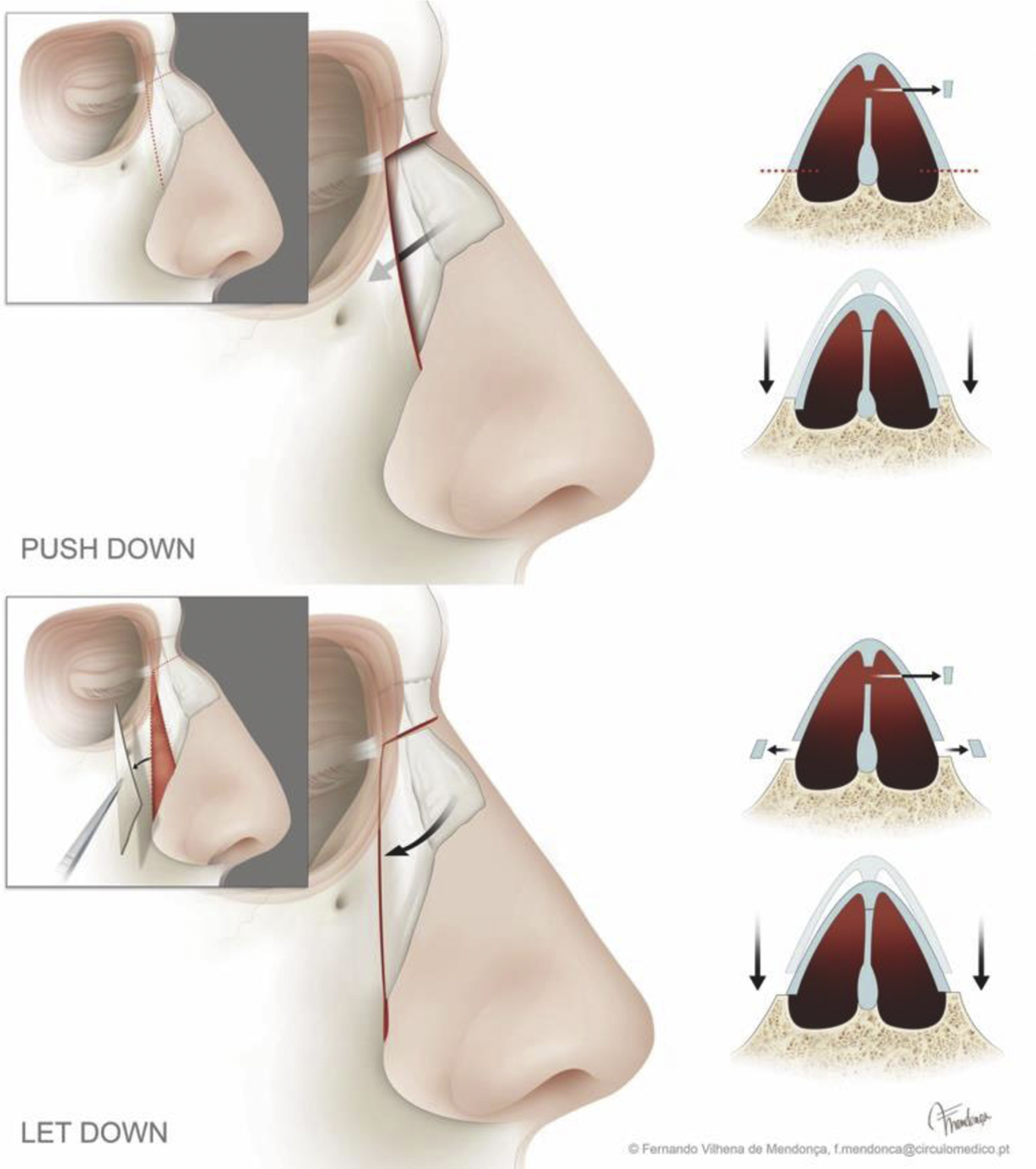 After the push down technique became popular, there were other surgeons such as Huffman and Lierle in 1954 and Huizing in 1975 who made variations of the technique as they argued that the amount of reduction that could be obtained in this way was limited. The “let-down technique” was then popularized, even if authors like Lothrop in 1914 had already described the resection of a triangular bony wedge of the lateral nasal wall. This considerably facilitates the downward movement of the nasal bones and avoids the narrowing of the nasal cavity (see Fig. 1 , let down).
