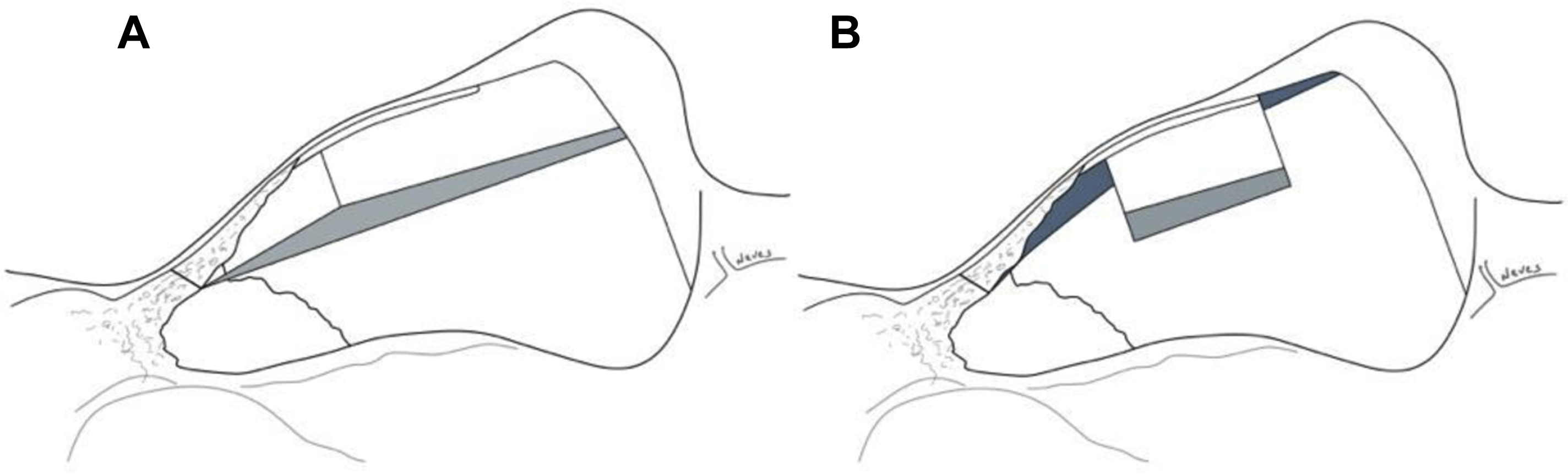The main author has been doing preservation techniques for more than 10 years, with his preference being the intermediate approach. He has developed 1 modification of the let down technique with a septal intermediate resection, the split preservation rhinoplasty ( Fig. 3 A) that showed the real advantage of the intermediate resection in stabilizing the rhinion position by putting a suture from our free anterior dorsal septal cartilaginous flap to the basal posterior stabile septum. In fact, this is a critical stitch for predictably keeping the rhinion in the desired position with great accuracy.