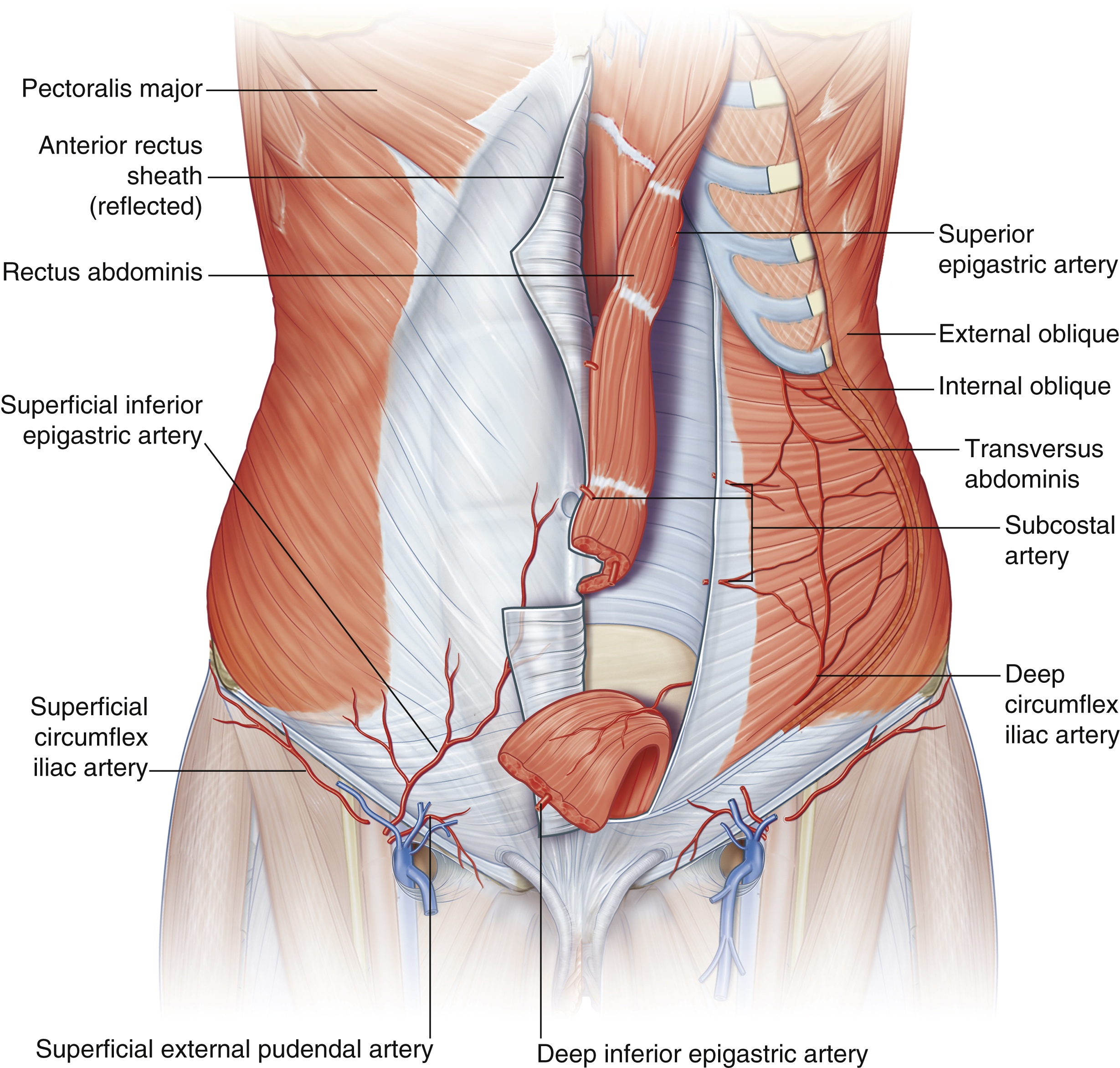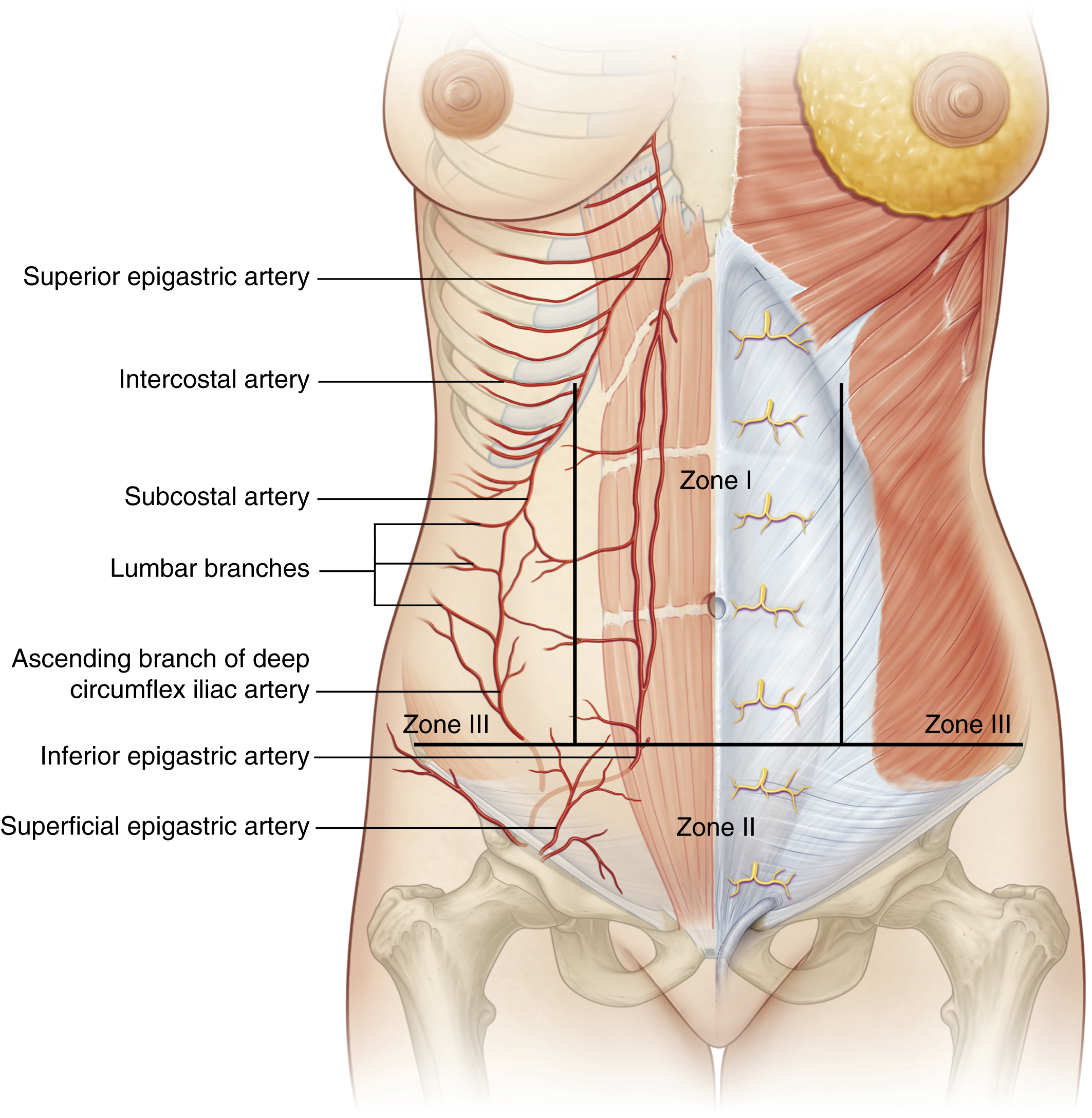 A detailed knowledge of the arterial supply of the abdominal wall is crucial to abdominal wall surgery, especially in cases of prior abdominal wall surgery. Huger described different zones of the abdominal blood supply which should guide the surgeon in planning and performing a safe operation. Huger defined zone I of the abdominal wall as the area that is fed anteriorly by the vertically oriented deep epigastric arcade. Zone III was defined as the lateral aspect of the abdominal wall (flanks) that are fed by the six lateral intercostal and four lumbar arteries. The lower abdominal circulation is provided by the superficial epigastric, superficial external pudendal, and superficial circumflex iliac systems (zone II). A rich plexus between these systems allows collateral flow (see Fig. 71.1 , Fig. 71.2 ).