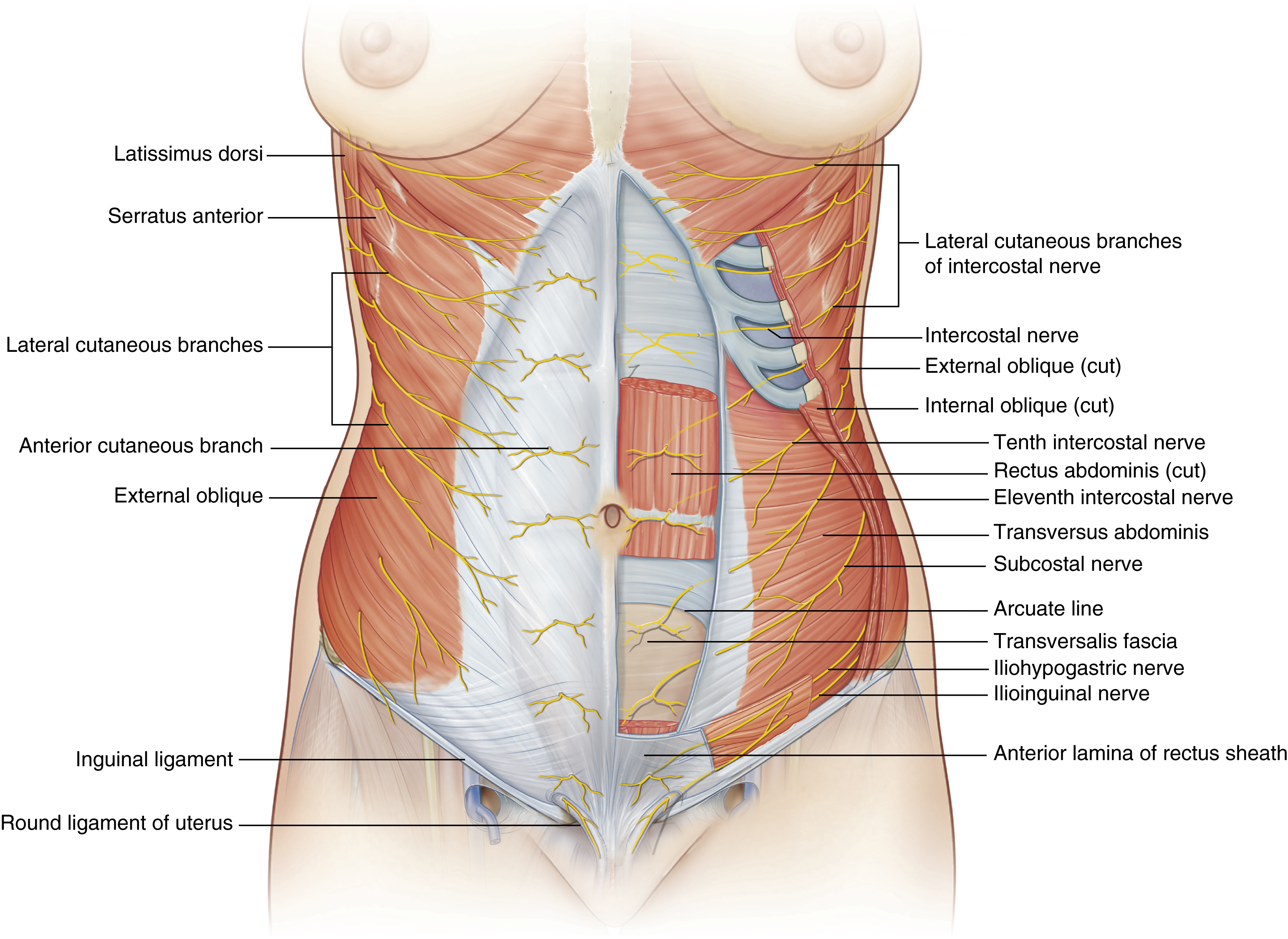 The sensibility of the abdominal wall derives from the anterior and lateral cutaneous branches of the eight to twelfth intercostal nerves, which reach the skin and fascia by passing between the internal oblique and transversus abdominis muscles and finally through the rectus abdominis muscle. The lateral cutaneous branches penetrate the intercostal muscles in the midaxillary line, ending in the subcutaneous layer.