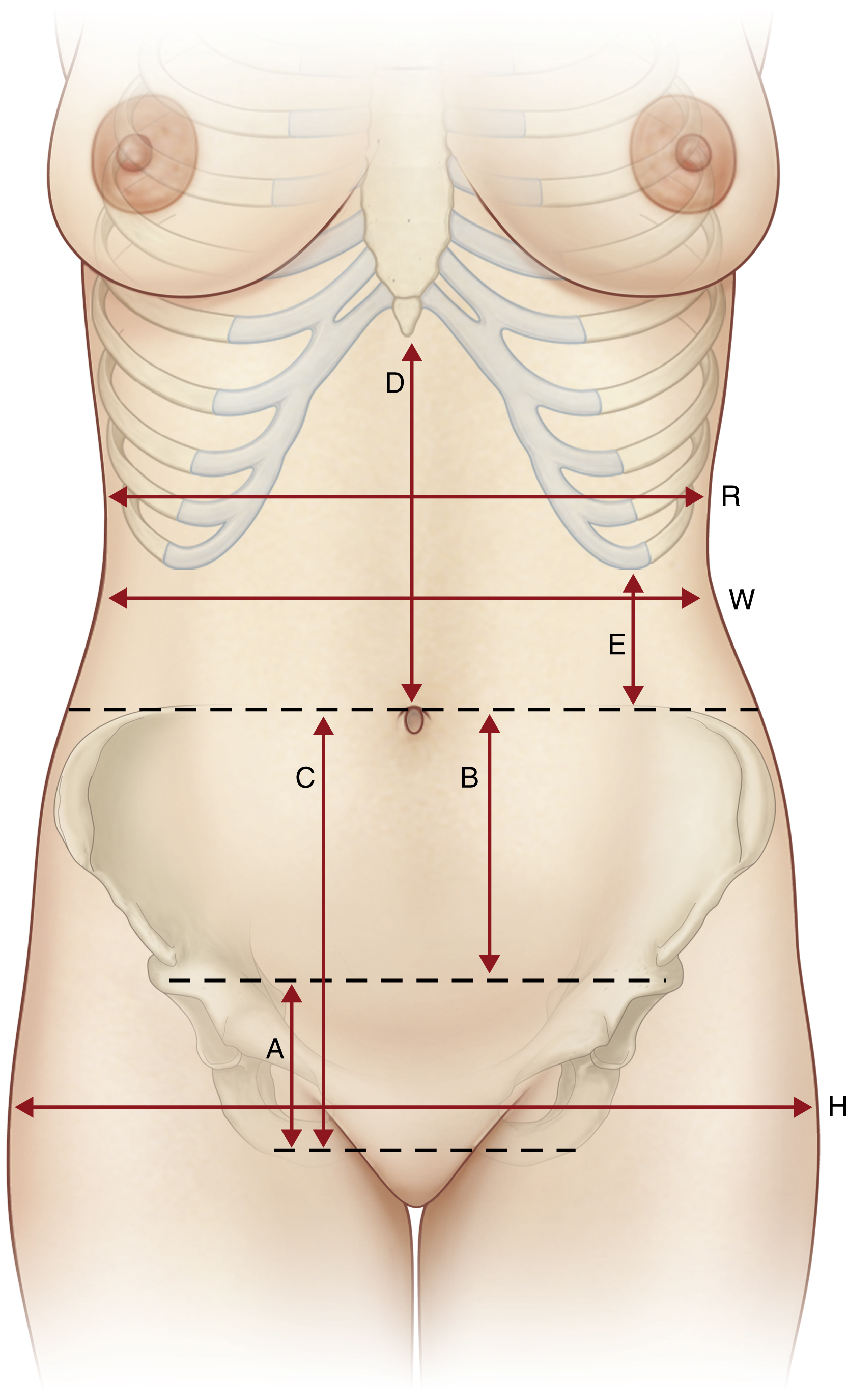 Hip width ( H ). A wider pelvis than rib cage emphasizes the waist; the waist is more defined when R < H.