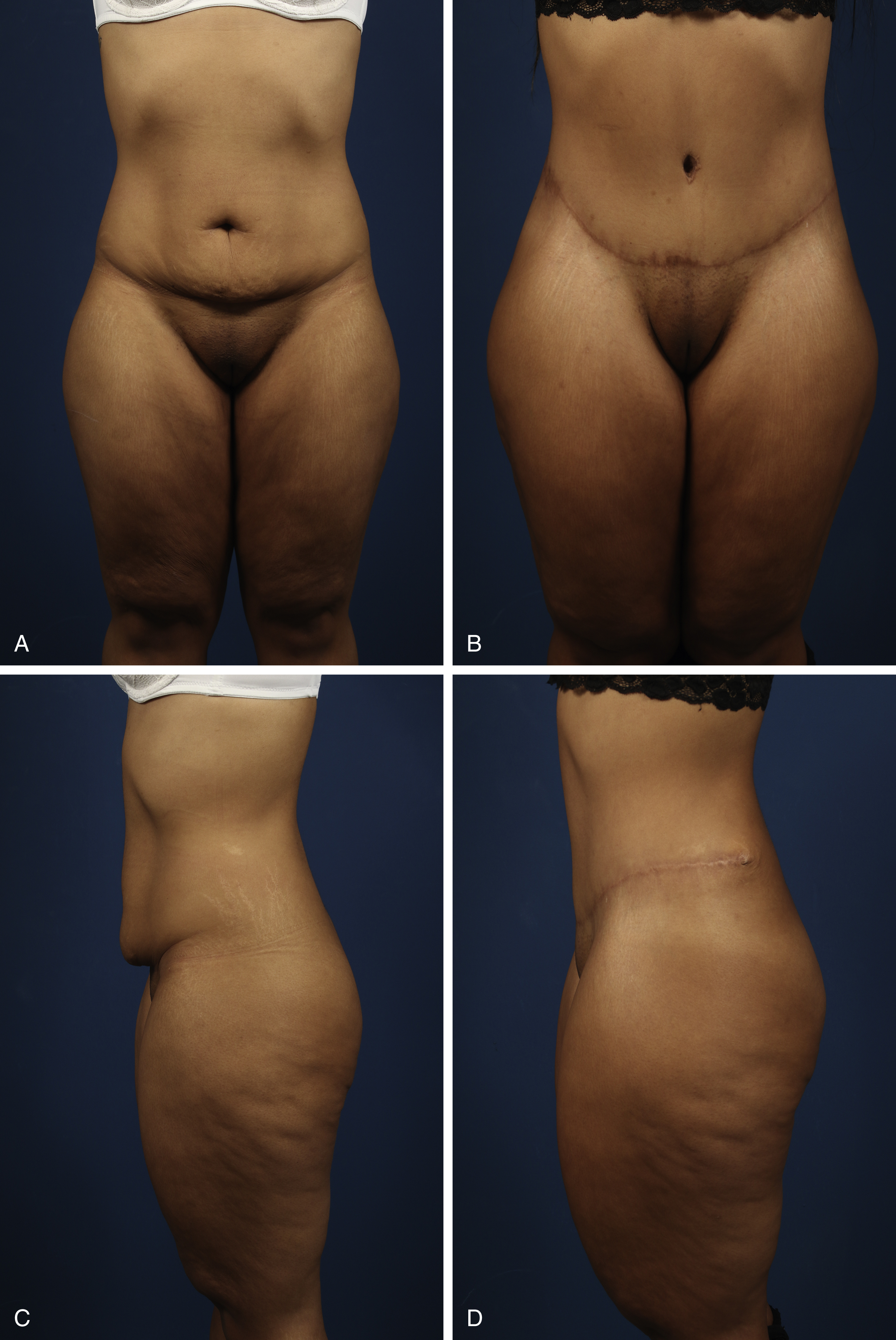 Physical examination is part of every medical history assessment. It evaluates the entire region the patient is concerned about. An examination of the skin tissue and the different fat layers is performed by pinching and measuring the subcutaneous layer thickness. Skin quality with the presence of striae should be noted, clarifying with the patient that supraumbilical striae will not be resected in abdominoplasty procedures (except for fleur-de-lis procedures). In this context, it is helpful to handout of studies on skin quality in postbariatric patients who have demonstrated damage to collagen structures. ,