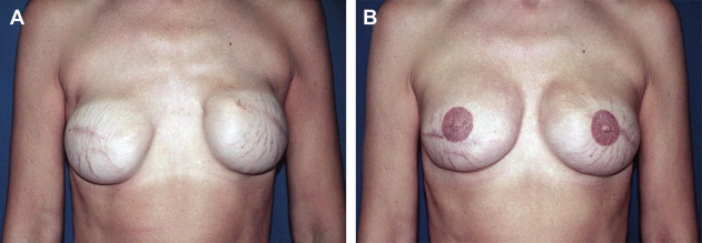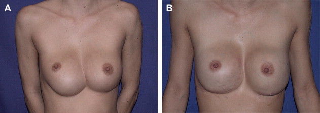 In conjunction with implant exchange and capsule revisions including bilateral medial capsulotomies and a right inferolateral capsulorrhaphy, a series of thick AlloDerm ® grafts (Lifecell Corp., Branchburg, NJ, USA) was placed. The grafts were affixed with resorbable sutures, with 1 edge of the graft across the junction of the anterior and posterior capsule. The concept was to define the boundaries of the capsule, smooth the transition from chest wall into the breast mound, and improve coverage of the implant. Long-term results have been stable, with now more than 10 years of follow-up (see CASE Fig. 1 B).