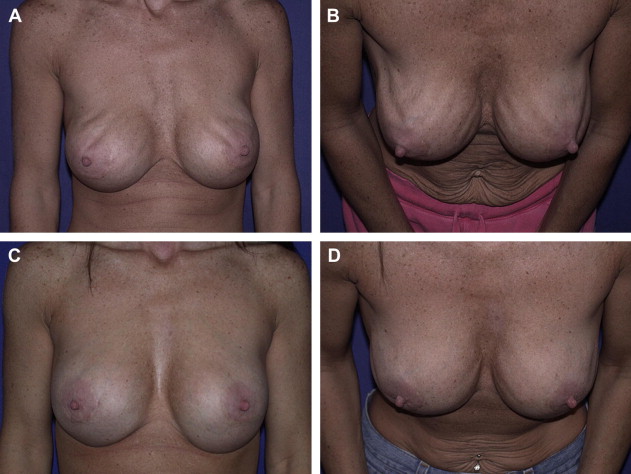 The surgical plan included replacement with moderate-profile implants (Allergan Style 15, 421 mL) and ADM grafting to all 4 quadrants (AlloDerm ® thick, 4 × 7 cm). This created an implant pocket separate from the skin envelope. Six-month follow-up confirmed stable correction (see CASE Fig. 3 C, D). The larger pieces of porcine-derived ADM available now would likely be a better choice.