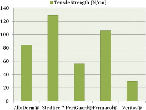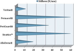 A few biomechanical differences that are of clinical relevance exist between the various ADMs. AlloDerm ® has been reported to have increased elasticity compared with DermaMatrix ® and Strattice™. This quality is relevant in situations in which increased elasticity is preferred, such as in addressing capsular contracture, or when the goal is for the ADM to conform to the inferolateral curvature of the breast. When the ADM is needed to provide support, such as in repositioning a displaced implant, a less elastic ADM like Strattice™ is preferred. Figs. 1–3 provide a comparison of the different biomechanical properties of various types of biologic meshes.