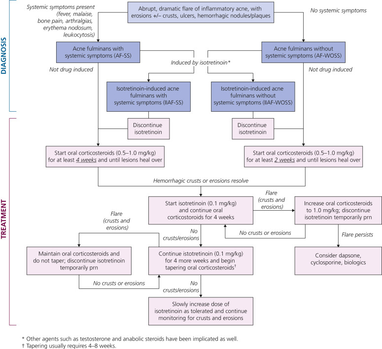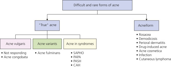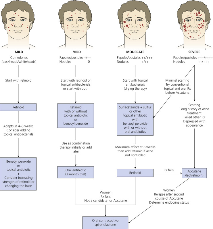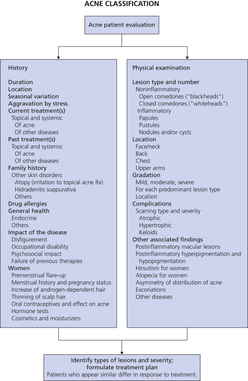 At the present time, there is no universally accepted acne classification/grading system. A useful acne classification/grading framework employs history and clinical patterns to formulate diagnosis and treatment ( Fig. 7.1 ). This pattern-diagnosis system takes into account the total impact of the disease, which is influenced by the disfigurement it causes. Degree of severity is also determined by occupational disability, psychosocial impact, and the failure of response to previous treatment.