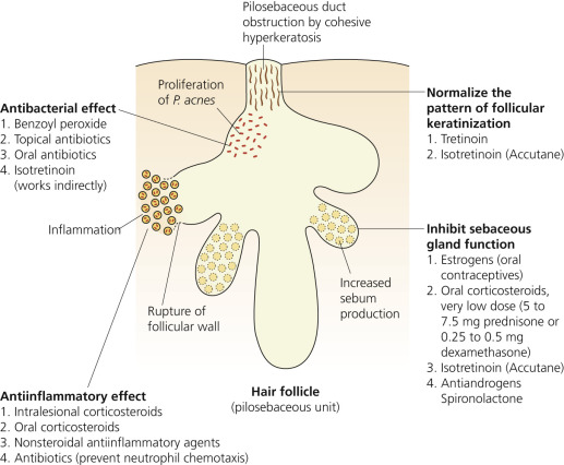 Fig. 7.4 illustrates the mechanism of action of therapeutic agents, and Fig. 7.5 illustrates the evolution of the different acne lesions. Acne is a disease involving the pilosebaceous unit and is most frequent and intense in areas where sebaceous glands are largest and most numerous. Acne begins in predisposed individuals when sebum production increases. Propionibacterium acnes proliferate in sebum, and the follicular epithelial lining becomes altered and forms plugs called comedones.