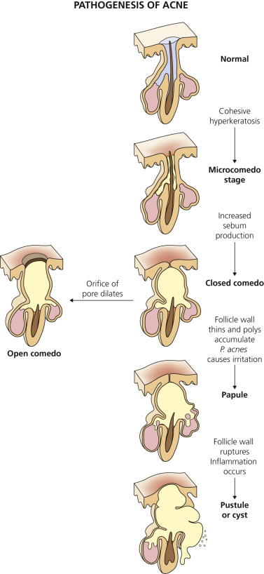 The early acne lesion results from blockage in the follicular canal. Increased amounts of keratin result from hormonal changes and sebum modified by the resident bacterial flora P. acnes . The increased number of cornified cells remain adherent to the follicular canal (retention keratosis) directly above the opening of the sebaceous gland duct to form a plug (microcomedo). Factors causing increased sebaceous secretion (puberty, hormonal imbalances) influence the eventual size of the follicular plug. The plug enlarges behind a very small follicular orifice at the skin surface and becomes visible as a closed comedone (firm, white papule). An open comedone (blackhead) occurs if the follicular orifice dilates. Further increase in the size of a blackhead continues to dilate the pore, but usually does not result in inflammation. The small-pore, closed comedone is the precursor of inflammatory acne papules, pustules, and cysts.