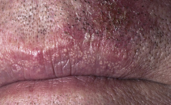 Cluster of sebaceous glands (tiny, white-yellow spots) that are normally present on the vermilion border of the upper lip.