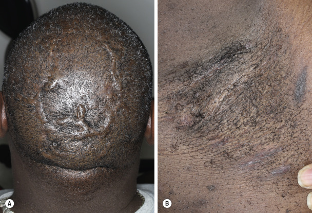 Acne lesions are divided into inflammatory and noninflammatory lesions ( Fig. 7.2 ). Noninflammatory lesions consist of open and closed comedones. Inflammatory acne lesions are characterized by the presence of one or more of the following types of lesions: papules, pustules, and nodules (cysts). Papules are less than 5 mm in diameter. Pustules have a visible central core of purulent material. Nodules are greater than 5 mm in diameter. Nodules may become suppurative or hemorrhagic. Suppurative nodular lesions have been referred to as cysts because of their resemblance to inflamed epidermal cysts. Recurring rupture and reepithelialization of cysts leads to epithelial-lined sinus tracts, often accompanied by disfiguring scars.