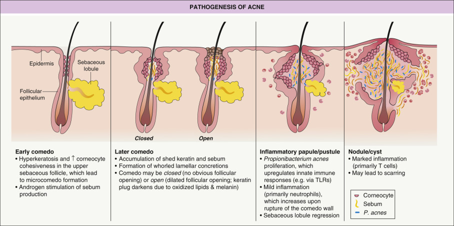 The development of acne involves the interplay of a variety of factors, including: (1) follicular hyperkeratinization; (2) hormonal influences on sebum production and composition; and (3) inflammation, in part mediated by P. acnes ( Fig. 36.1 ). Appreciating the anatomy and physiology of the pilosebaceous unit is essential to understanding the pathogenesis of acne and designing effective treatment regimens. The structure and function of sebaceous glands are reviewed in detail in Chapter 35 , with summaries of their roles in acne in Table 35.4 and Fig. 35.5 .