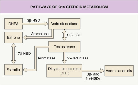 The sebaceous gland is controlled primarily by androgens, with additional influences from other hormones and neuropeptides (see Table 35.4 ). Androgens are produced both outside the pilosebaceous unit, mainly by the gonads and adrenal glands, and locally within the sebaceous gland via the action of androgen-metabolizing enzymes such as 3β-hydroxysteroid dehydrogenase (HSD), 17β-HSD and 5α-reductase ( Fig. 36.2 ). Androgen receptors, found in the cells of the basal layer of the sebaceous gland and the outer root sheath of the hair follicle, are responsive to testosterone and 5α-dihydrotestosterone (DHT), the most potent androgens. DHT has a 5–10-fold greater affinity than testosterone for the androgen receptor and is thought to be the principal androgen mediating sebum production.