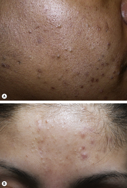Acne is typically found in sites with well-developed sebaceous glands, most often the face and upper trunk. Despite evidence that inflammation is present in even the earliest comedones, acne lesions are divided into non-inflammatory and inflammatory groups based upon their clinical appearance. Non-inflammatory acne is characterized by open and closed comedones ( Fig. 36.3 ). The histologic features of these follicular-based lesions are reflected in their clinical appearance. Closed comedones (whiteheads) are generally small (~1 mm), skin-colored papules with no apparent follicular opening or associated erythema. These lesions may be subtle and better appreciated upon palpation, stretching, or side-lighting of the skin. In contrast, open comedones (blackheads) have a conspicuous dilated follicular opening that is filled with an inspissated core of shed keratin (see Fig. 36.5 ). Melanin deposition and lipid oxidation within the debris may be responsible for the black color.