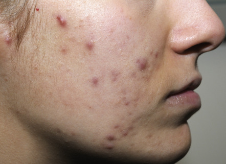 Inflammatory acne beyond 25 years of age is most common in women and may be associated with a high level of psychological stress . The majority of affected women present with findings similar to those of adolescent acne, with a mixture of inflammatory and comedonal lesions involving various facial sites and sometimes the trunk . Although the mandibular area is involved in ~80% of women with acne, a distinct smaller subset has inflammatory papules, pustules, and nodules exclusively in this location. Half of women report persistence of their acne since its onset, often during adolescence, while one-quarter describe periods of remission followed by recurrences. Premenstrual flares are common , but only ~20% of women with acne have irregular menses. Up to 30% of those in the latter group have other signs of hyperandrogenism, such as hirsutism and androgenetic alopecia (see below). A predominantly comedonal, adult-onset form of acne that is associated with smoking has also been described .
