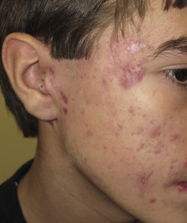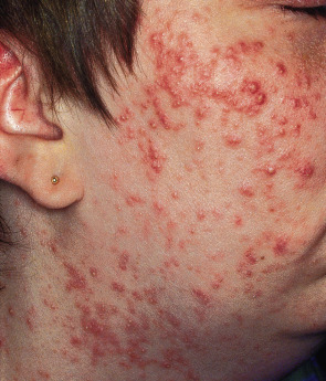 Acne fulminans is the most severe form of acne and is characterized by the abrupt development of nodular and suppurative acne lesions in association with systemic manifestations. This uncommon variant primarily affects boys 13–16 years of age. Patients typically have mild to moderate acne prior to the onset of acne fulminans, when numerous microcomedones suddenly erupt and become markedly inflamed. There is rapid coalescence into painful, oozing, friable plaques with hemorrhagic crusts ( Fig. 36.10 ). The face, neck, trunk, and arms are all affected. Lesions tend to ulcerate and can lead to significant scarring.