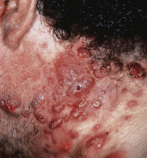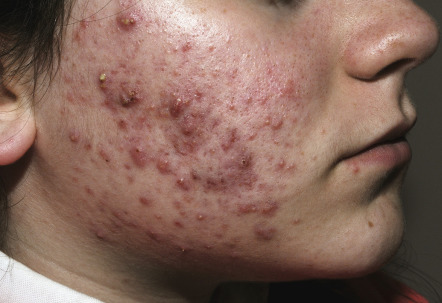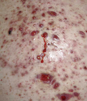 Acne conglobata is a severe form of nodulocystic acne that may have an eruptive onset but without systemic manifestations. This recalcitrant acne variant is part of the follicular occlusion tetrad, along with dissecting cellulitis of the scalp, hidradenitis suppurativa, and pilonidal sinus (see Ch. 38 ).