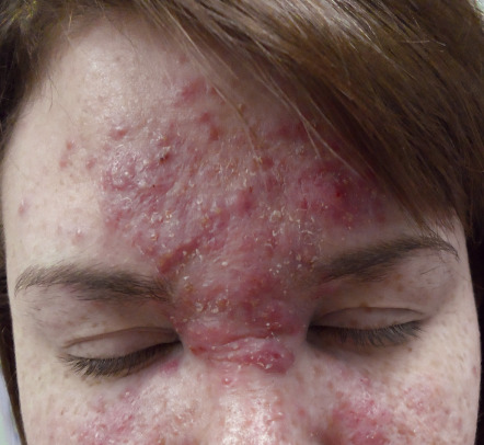 An unusual and disfiguring complication of acne vulgaris is solid facial edema (Morbihan disease). Clinically, there is a distortion of the midline face and cheeks due to soft tissue swelling ( Fig. 36.11 ). The woody induration may be accompanied by erythema. Impaired lymphatic drainage and fibrosis (potentially induced by mast cells) in the setting of chronic inflammation are thought to be involved in the pathogenesis of solid facial edema, and a report of its occurrence in identical twins with acne suggests that genetic factors may also have a role. Similar changes have been described in patients with rosacea (see Table 36.2 ). Although fluctuations in severity are common, solid facial edema does not usually resolve spontaneously. Treatment with isotretinoin (0.2–1 mg/kg/day) for 4–6 months has been reported to lead to improvement, although a more extended course of 9–24 months is often required . Combination of isotretinoin with ketotifen 1–2 mg/day (not available in the US) or prednisone 10–30 mg/day may have additional benefit .