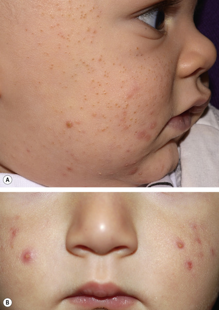 Neonatal acne occurs in more than 20% of healthy newborns (see Ch. 34 ). Lesions usually appear at about 2 weeks of age and generally resolve within the first 3 months of life. Small papulopustules (not comedones) arise primarily on the cheeks, forehead, eyelids and chin, although the neck and upper trunk can also be involved (see Fig. 34.6 ).