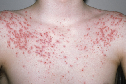 High-dose intravenous or oral corticosteroids commonly induce characteristic acneiform eruptions with a concentration of lesions on the chest and back (see Fig. 36.13 ). Steroid-induced acne (and rosacea) can also result from the inappropriate use of topical corticosteroids on the face. Inflamed papules and pustules develop on a background of erythema that favors the distribution of corticosteroid application. Lesions eventually resolve following discontinuation of the corticosteroid, although “steroid dependency” can lead to prolonged and severe flares post-withdrawal (see Ch. 37 ).