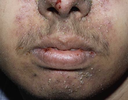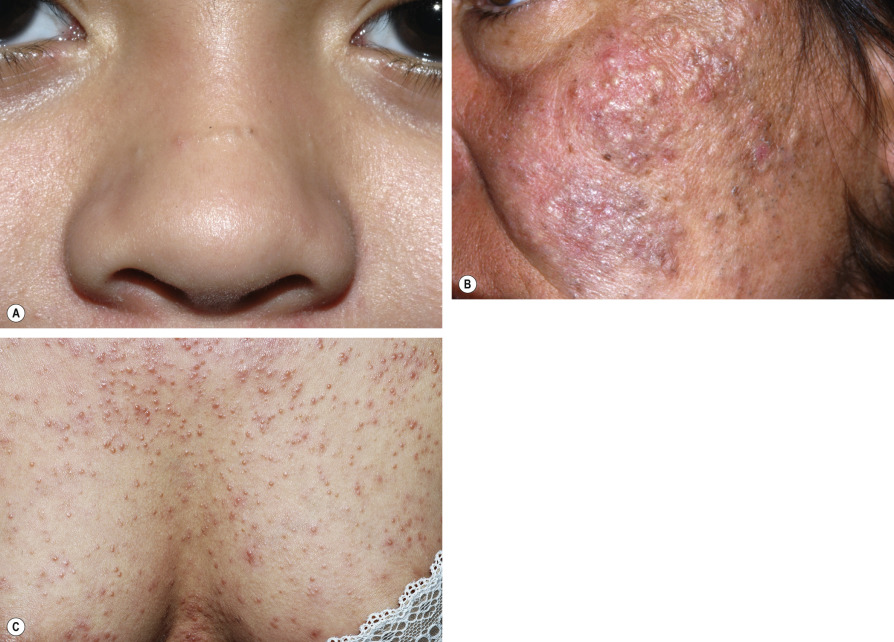 Acne or acneiform eruptions (e.g. folliculitis) can be seen as a side effect of a number of medications ( Table 36.1 ). An abrupt, monomorphous eruption of inflammatory papules and pustules is often observed in drug-induced acne ( Figs 36.13 & 36.14 ), in contrast to the heterogeneous morphology of lesions seen in acne vulgaris. When a history of prescription medication use is not elicited, a comprehensive review of all over-the-counter medications and supplements, as well as recent medical procedures, may reveal the responsible agent (see Table 36.1 ). Bodybuilders and athletes should be questioned about anabolic steroid use.