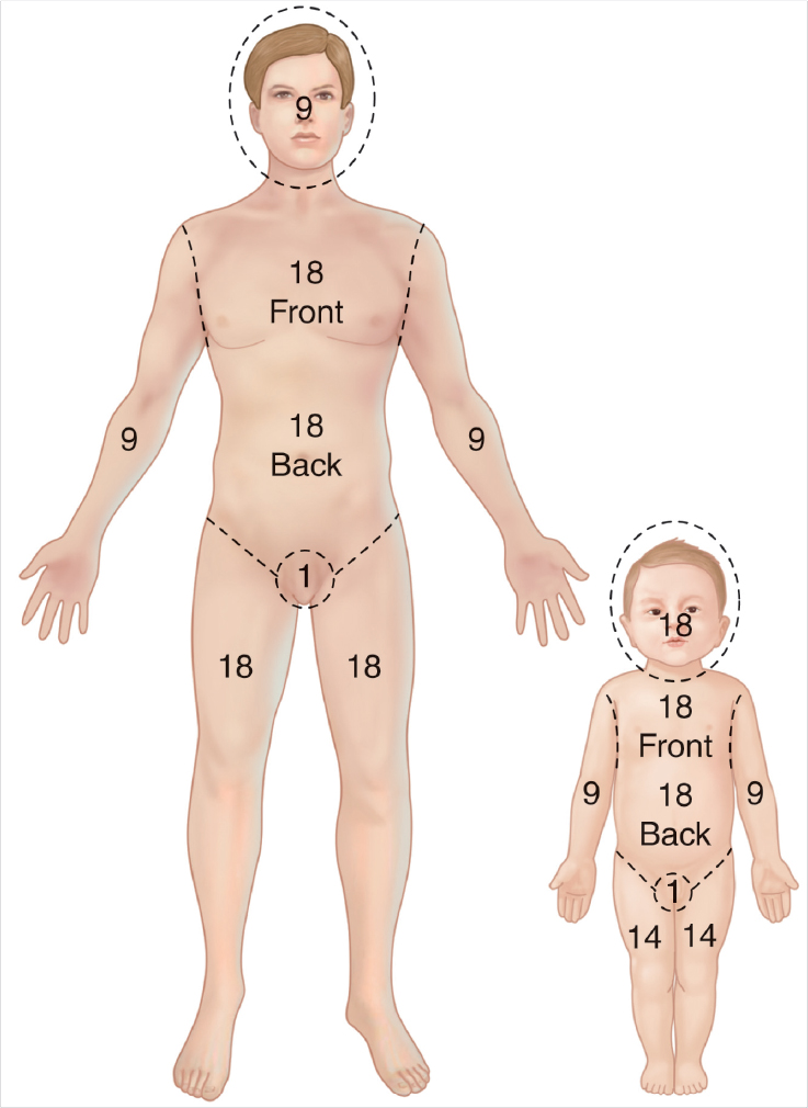 Rule of nine for estimation of burn injury. Note the increase in proportion of the size of the head in children.