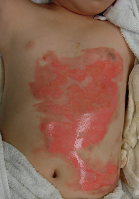 Burn injuries can be described by the source of the heat: scald, flame, contact, and chemical ( Fig. 4.1.4 ). Although the mechanism of the injury may be different, the end result is the same with injury to the skin. Loss of a portion of the skin leads to lack of temperature regulation, fluid and protein loss, electrolyte imbalance, and a propensity for infection. Electrical injuries must be differentiated from other burn injuries due to their propensity for significant internal damage. The electrical current can travel through the body, emitting thermal energy internally. The cutaneous injury may be relatively small, whereas the underlying tissue necrosis may be extensive.