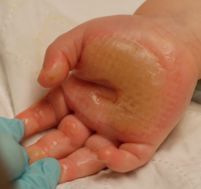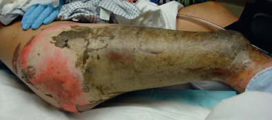 Burns that involve only the epidermis are classified as first-degree burns and do not warrant special care. Burns that involve the epidermis and a portion of the dermis are classified as second-degree or partial-thickness burns. These burns may be moist and pink or have fixed hemoglobin and appear cherry red and dry, depending on the depth of dermal involvement ( Fig. 4.1.1 ). Burns involving the epidermis and entire dermis down to the subcutaneous tissue are third-degree or full-thickness burns ( Fig. 4.1.2 ). These burns are white, yellow, or brown with a leathery texture ( Fig. 4.1.3 ). Lastly, burns extending through the entire dermis into the subcutaneous tissues, muscle, or bone are fourth-degree burns and are the most severe burns that we treat. These burns may present similarly to third-degree burns, and it is not until excision is performed that the depth is appreciated. Alternatively, they may present with black, charred eschar and exposure of the underlying structures.