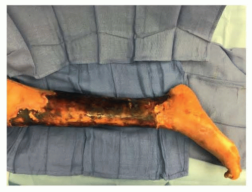 Full-thickness injuries may present as white, yellow, or brown leathery, insensate areas that lack capillary refill. With time, they will progress to a black eschar (FIG 1).