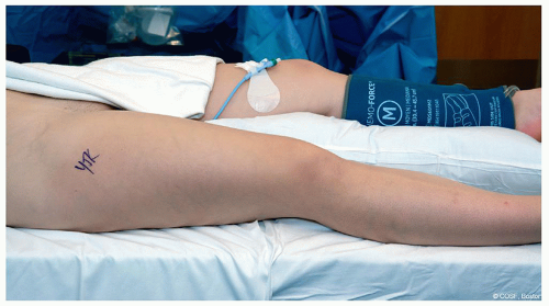 • Tensor fascial is incised from the anterior superior iliac spine (ASIS) going distal and lateral at approximately 30° angle (Figure 21.4)