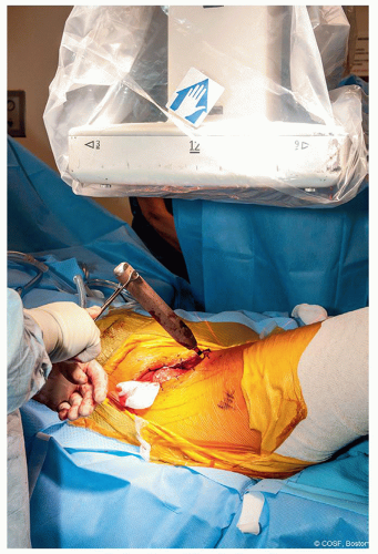 • Verify the position of the Ganz osteotome using fluoroscope in the AP position (Figure 21.10)