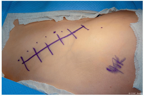 • Bikini skin incision is marked: start 1 cm below iliac crest to 1 to 2 cm past the anterior line over the hip joint (Figure 21.2)